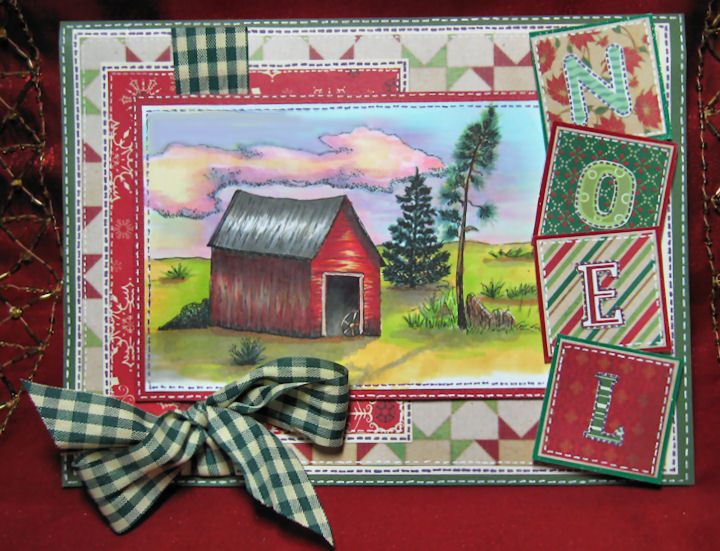 Hello again! I'm back with my third (and the last one for today) project for round 6 of CDAC's Progressive Freebies Challenge. This card features an image created by Ginger Loft. This scene reminded me very much of rural Louisiana where my ex-husband's family lives so I colored it to look like one of the thousands of country homesteads that litter the highways and byways of that state. It rarely snows there around Christmas so I didn't put snow on the ground, which is very sandy. The area where they lived, close to Lake Charles, is known for its lumber industry and there are huge pine trees everywhere. In fact, that area of East Texas and western Louisiana is known as the Piney Woods. The shack, or shed as they are called in Louisiana, is also a familiar sight so how could I had to call this one "A Louisiana Christmas". My mother-in-law loved to quilt and the dp I used looks very much like some of the old traditional quilt patterns. I also made my greeting resemble quilt blocks with patterned paper that reminds me of quilt fabric and faux stitching around the edges of the "blocks" and letters, which spell NOEL.